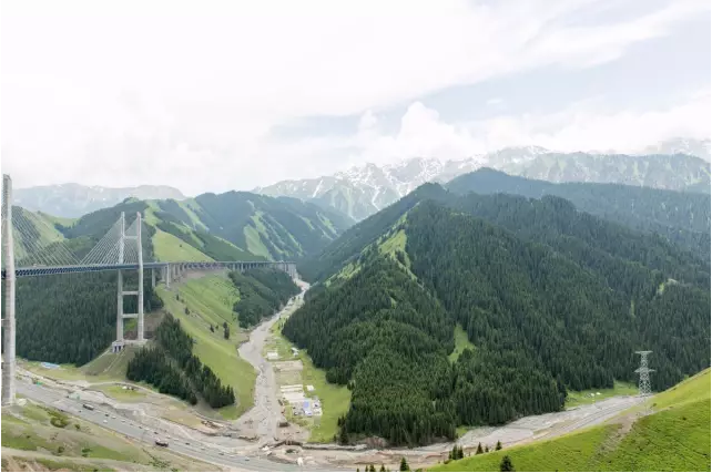 雪山、兰天、白云、森林、草原、盘山路、跨山的果子沟大桥